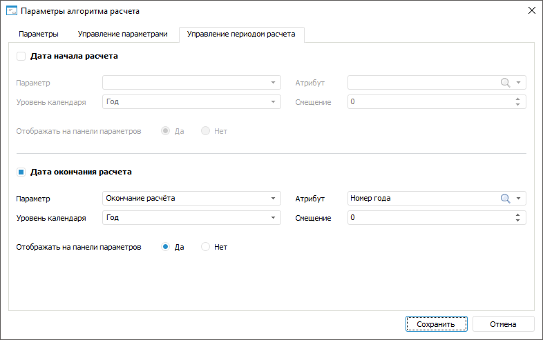 Для возврата к заданию пользователем начала или окончания расчёта алгоритма снимите флажок «Дата начала расчёта» или «Дата окончания расчёта» соответственно.