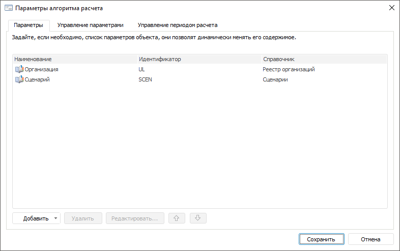 Для добавления и настройки параметров алгоритма расчёта: