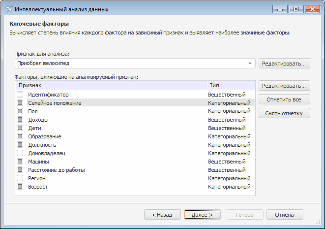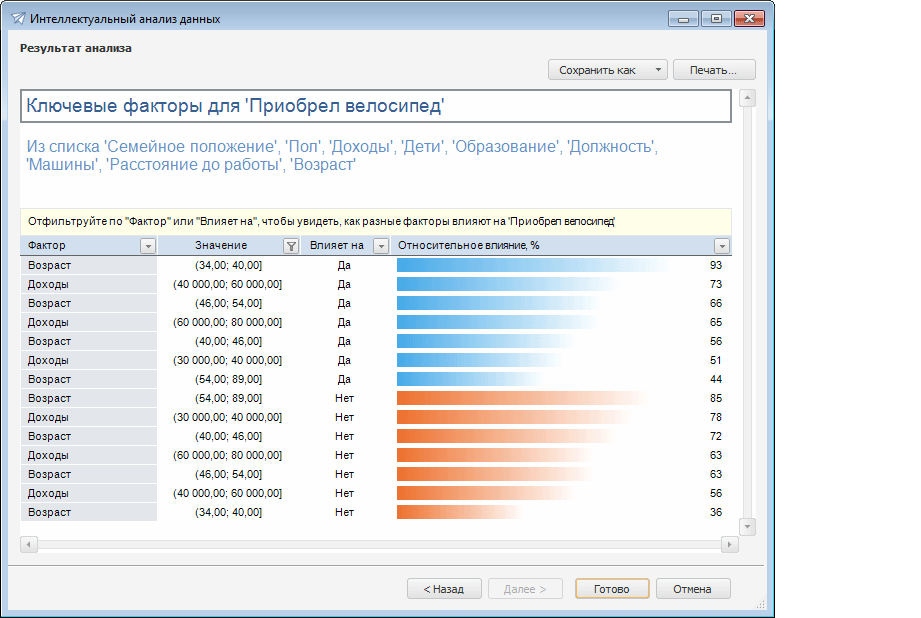 Данный вид анализа вычисляет степень влияния каждого фактора на зависимый признак и выявляет наиболее значимые факторы.
