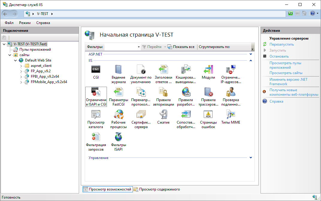 В дереве «Подключения» выберите корневой элемент и дважды кликните «Ограничения ISAPI и CGI»: