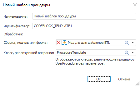 Обработчик. В раскрывающихся списках выберите объект среды разработки (сборку, модуль, форму Fore или Fore.NET) и класс, содержащий реализацию процедуры UserProcedure. Класс может быть унаследован от IEtlForeWizardPages, при этом в мастере на базе шаблона будет добавлена дополнительная страница.