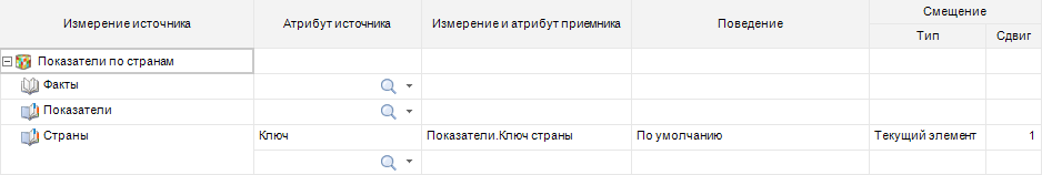 Например, есть измерение «Показатели» в приёмнике данных и измерение «Страны» в источнике данных. Измерения содержат следующие данные и в них задана следующая отметка: