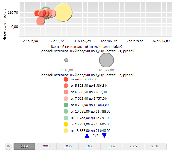 // Создаем массив со значениями цветовой шкалы матрицы var palette = [ "RGB(255,70,44)", "RGB(255,112,91)", "RGB(255,147,132)", "RGB(255,182,172)", "RGB(107,188,128)", "RGB(142,204,158)", "RGB(169,216,181)", "RGB(255,217,0)", "RGB(255,232,106)", "RGB(255,239,153)" ]; // Применяем цветовую шкалу матрицы bubbleChart.applyColorScheme(palette); // Получаем легенду пузырьковой диаграммы var legend = bubbleChart.getLegend(); // Запрещаем автоматический расчет количества столбцов легенды legend.setAutoColumnsCount(false); // Устанавливаем количество столбцов легенды legend.setColumnsCount(1); // Устанавливаем режим разбиения легенды на страницы legend.setPageMode(PP.Ui.LegendPageMode.MultiplePages); // Обновляем пузырьковую диаграмму bubbleChart.refresh();