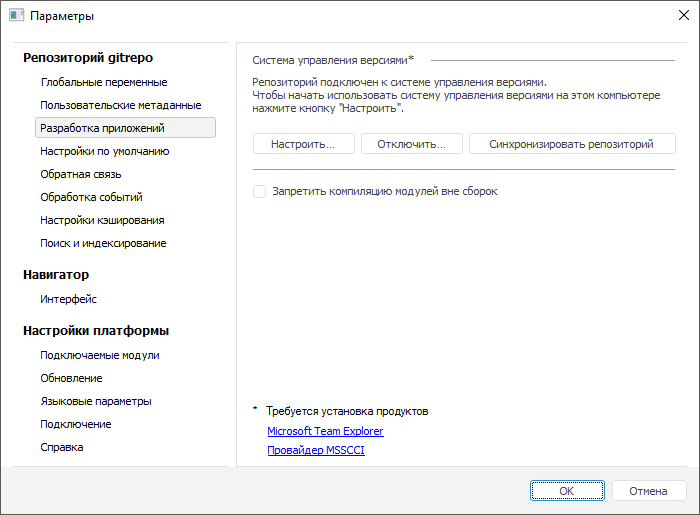Примечание. Пользователи, компьютеры которых не были настроены на работу с системой управления версиями, будут использовать версии объектов, хранящихся в репозитории. При этом вкладка «Разработка приложений» в окне «Параметры» будет принимать вид аналогично виду вкладки после подключения репозитория к системе управления версиями.