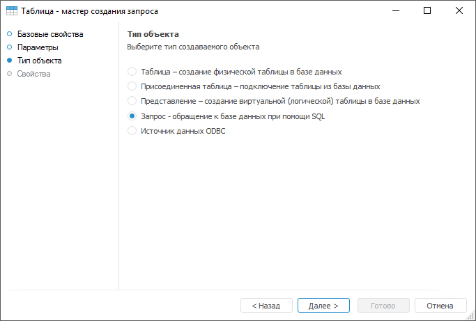 После выполнения одного из действий будет открыт мастер создания таблицы. На странице «Базовые свойства» укажите наименование объекта и идентификатор. На странице «Параметры» задайте список параметров, которые будут использоваться при выполнении запроса. На странице «Тип объекта» в списке отметьте тип создаваемого объекта - «Запрос»: