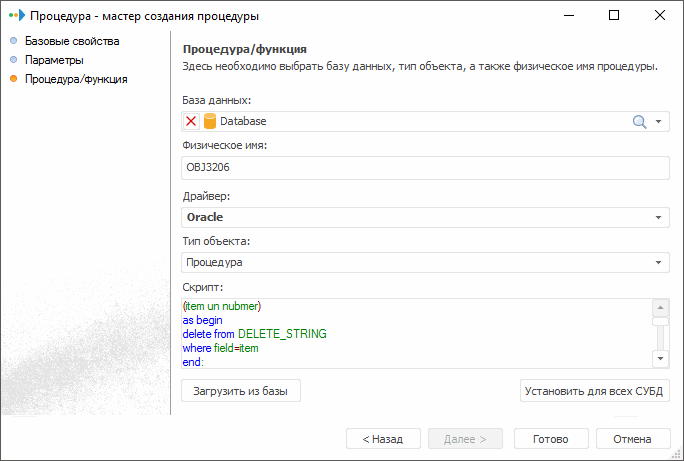 На данной странице выбирается база данных, драйвер, указывается тип объекта и скрипт.