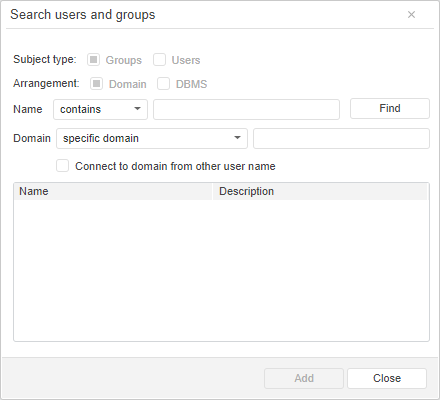 For details about how to work with dialogs of domain user group selection, go to the Selecting Users and Groups section.