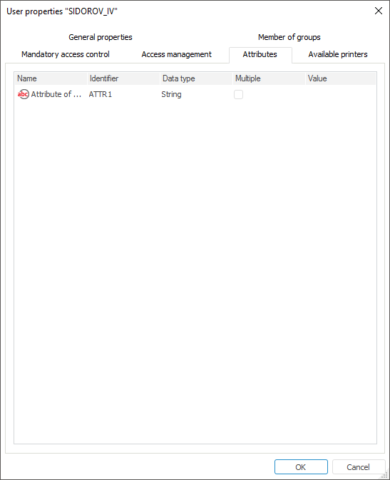 NOTE. On separating roles the Attributes tab will be available only to information security administrator with the Changing User Permissions, Distributing Roles, Changing Policy or Changing Security Label and Access Control List of Any Object privilege.