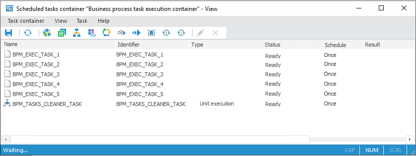 NOTE. If scheduled tasks container with the BPM_EXECUTOR_CONTAINER identifier is absent or empty, then select the Initiate Task Container item on the Debug page of the Setting Up Parameters and Administrating Business Processes dialog box.