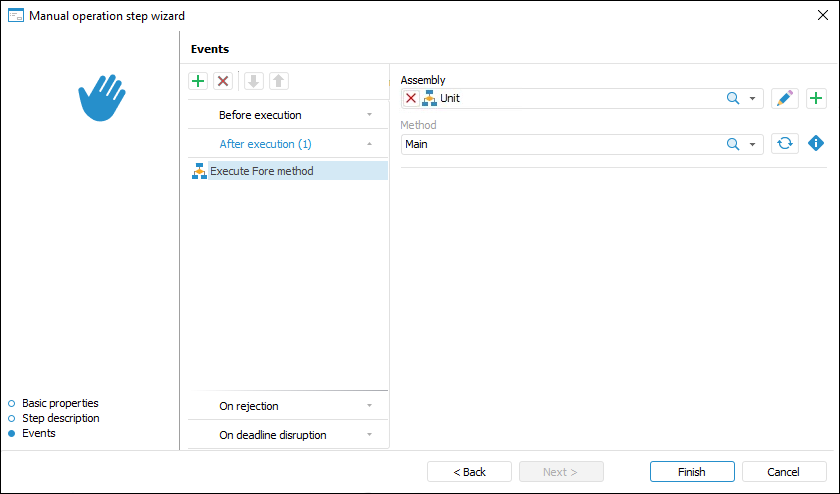 The Manual Operation Step is used to describe tasks that are executed by user without any automated execution operation.For example, the contract signature or discharge of goods.To create the step, open manual operation wizard.