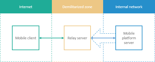 Relay server is a server, at which Relay service is deployed. Relay service enables the user to establish a connection between a mobile device and mobile platform server on heightened requirements to protection of internal corporate network data. In this case DMZ ports into internal network are closed, only ports from internal network into external network are opened.