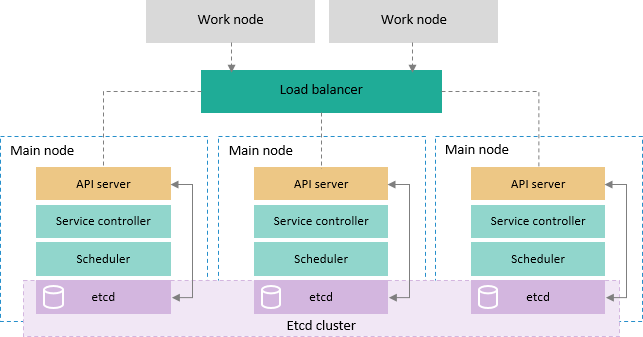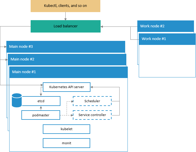The schema displays work of Kubernetes system services on main cluster nodes and also interaction of main nodes with work nodes and incoming requests via special services with load balancing support.