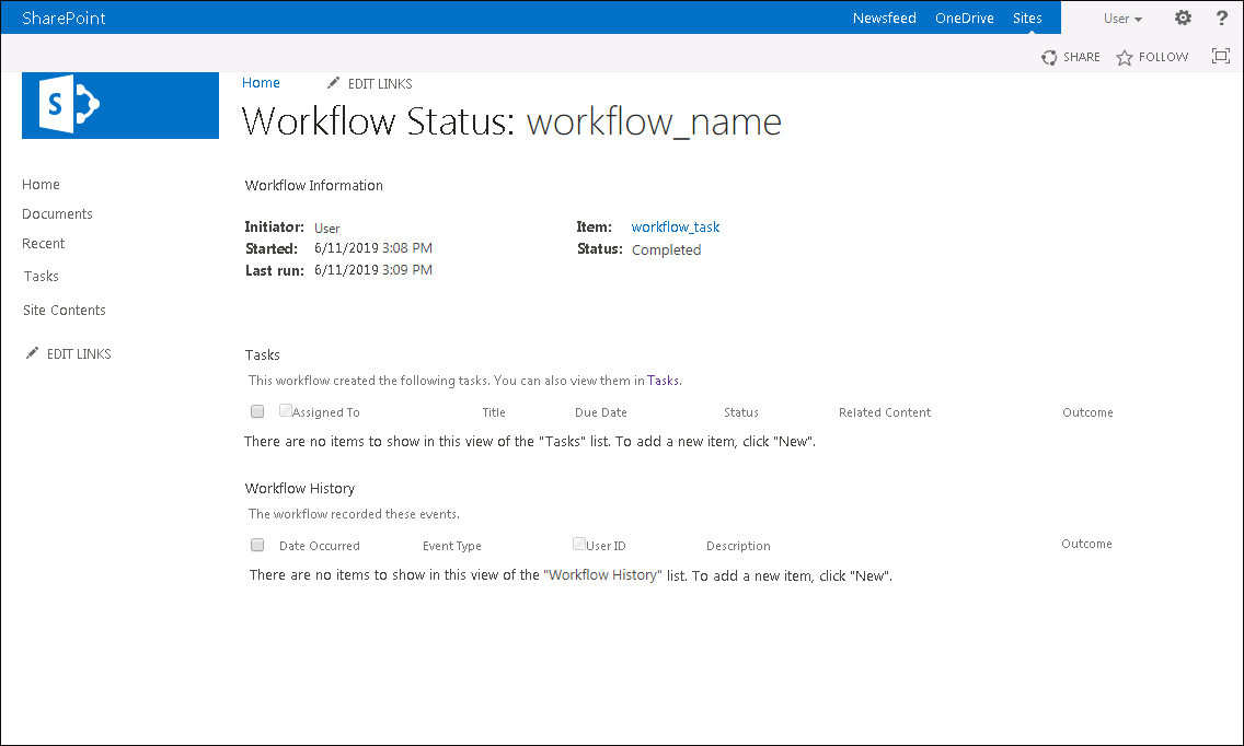 To view the workflow status, open the link next to the workflow name in the tasks list. The workflow status is displayed: