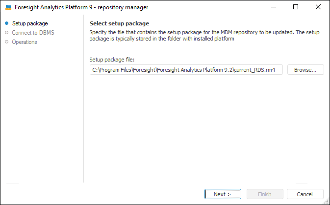 The path to the file with *.rm4 extension storing executable scripts is selected automatically. This file is included in the standard installation package and is located in S\Rm\current_RDS.rm4, where S is a path to the folder with installed Foresight Analytics Platform.