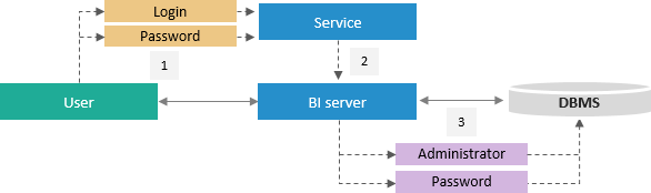 The BI server addresses the DBMS by means of integrated administrator user credentials.