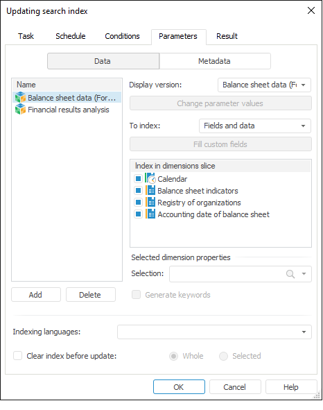 A search index update task is used if BI search is set in repository. On setting up a task, additional parameters are added to the Parameters tab: