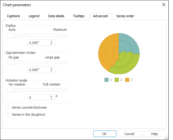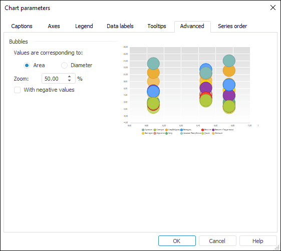 To set up additional parameters of mixed, pie, doughnut, waterfall charts, histogram, histogram with fluctuation intervals and bubble chart, go to the Advanced tab of the Chart Parameters dialog box.