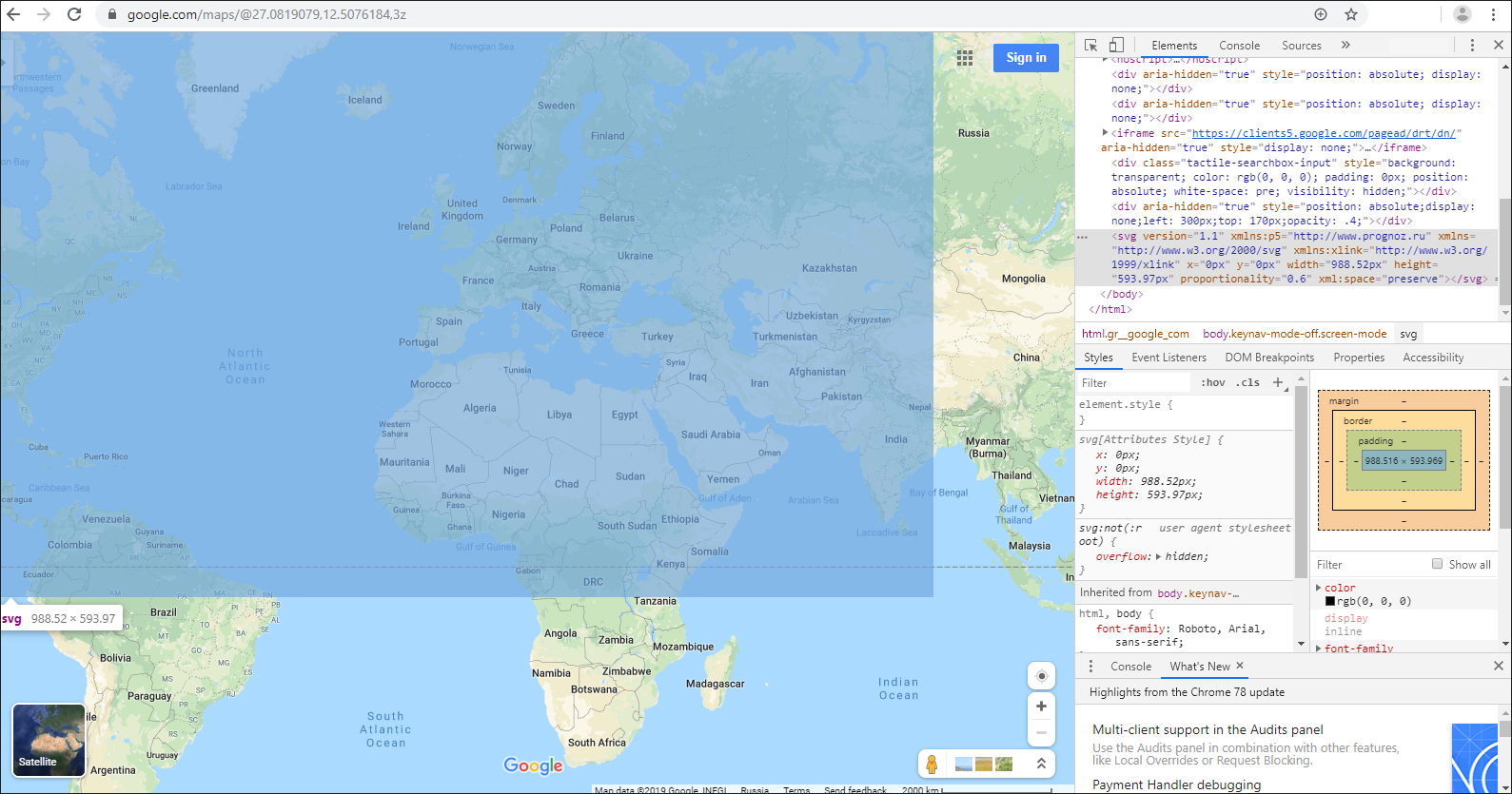 Select the <svg> tag, go to the Styles section and set styles of added map in the element.style section to display it with Google map or Yandex map in the background: