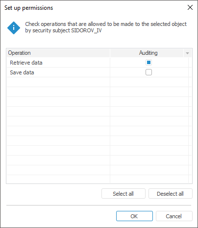 Select checkboxes of permissions for the operations executed with the selected object for a user or a group of users by means of multiple selection or buttons and context menu items: