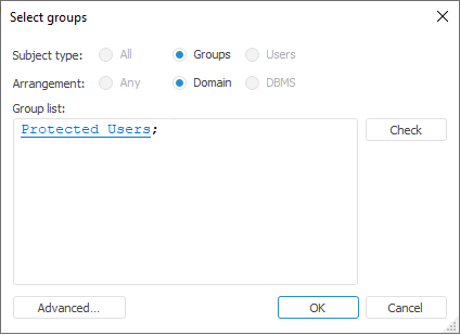 For details about how to work with dialogs of domain user group selection, go to the Selecting Users and Groups section.