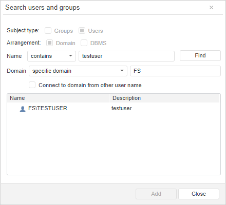 For details about how to work with dialogs of domain user selection, go to the Selecting Users and Groups section.
