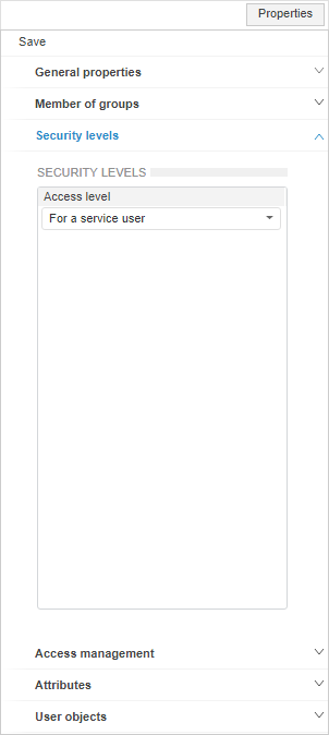 To select a security level, use the Security Levels tab in the User Properties dialog box in the desktop application and on the Properties side panel in the web application: