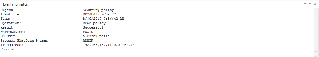 After executing one of the operations, the window is located by default at the bottom of the security manager: