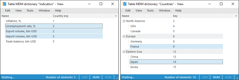 For example, the data consumer contains the Indicators dimension and the data source contains the Countries dimension. The dimensions contain the following data and the following selection: