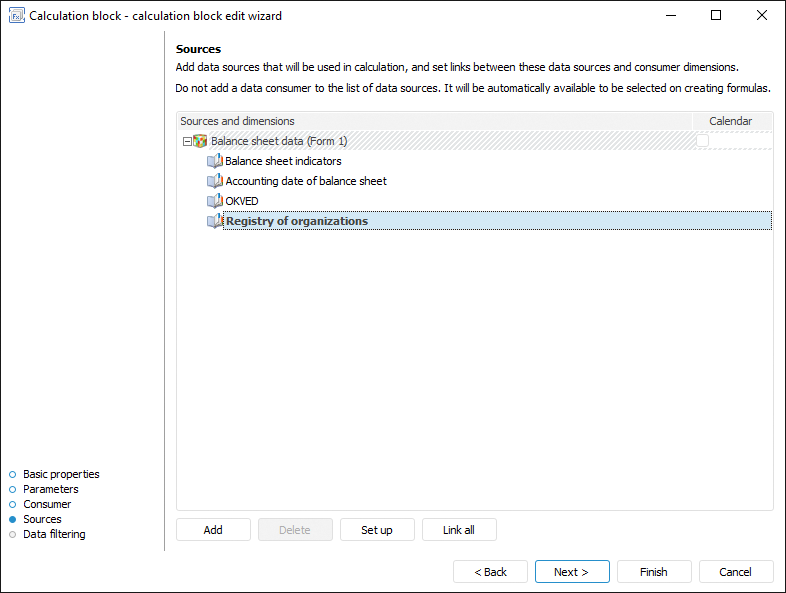 Data sources can be selected and set up on the Sources page in the calculation block editing wizard: