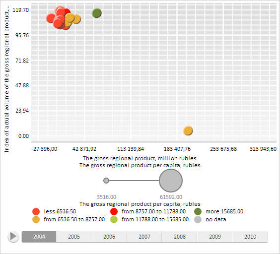 To execute the example, the HTML page must contain the BubbleChart component named bubbleChart (see Example of Creating the BubbleChart Component). Clear data of the X time axis. Determine and set new arrays of data for X and Y time axes. For the X time axis add a new element to the end of data array, add and remove elements by specified indices. Replace an element in the position with specified index in Y time axis. Show the number of time axes elements and the first non-empty value of the X time axis: