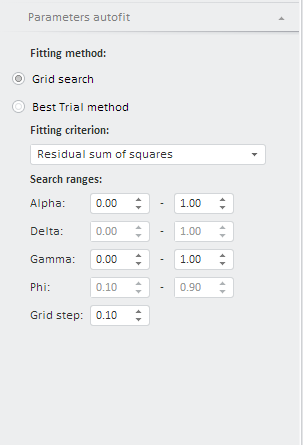 To show this panel, click Forecasting in the Calculations ribbon tab, choose Exponential Smoothing in drop-down menu, and open the Parameters Autofit panel in the Series tab of the side panel.