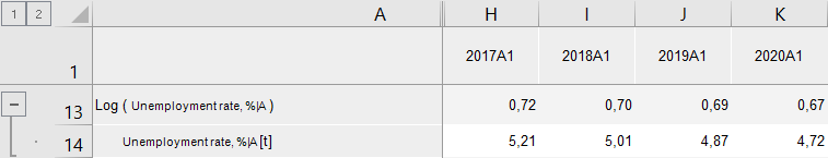 The Log function returns logarithm for a series by the specified basis, for example: Log10(X[t]). It is included in the group of arithmetic functions.