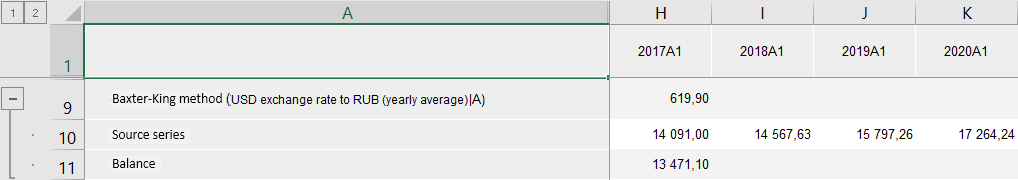 After the method is applied, a series with the name of the Baxter-King Method(<Series_Name>) type and containing calculation results is added to the data table for each of the selected series. For example: