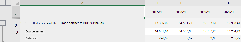 After the method is applied, a series with the name of the Hodrick-Prescott Filter(<Series_Name>) type and containing calculation results is added to the data table for each of the selected series. For example: