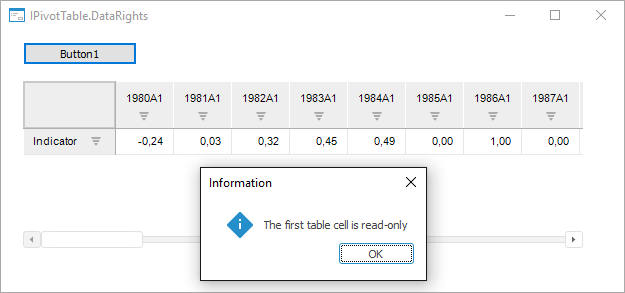 After executing the example the form will display data table, the dialog box containing message about access permissions to the first table cell opens:
