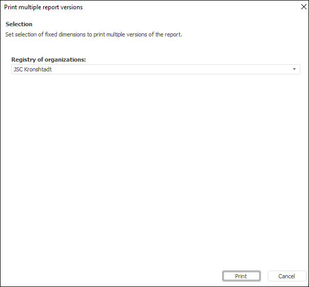 The number of report versions equals to the Cartesian product of all the elements selected in fixed dimensions. For example, a report contains two controls shared by all the report sheets. If the user selects two elements for each dimension when executing a batch operation, the number of possible pairs based on these elements (that is, the Cartesian product) is four. Therefore, four report versions are created.