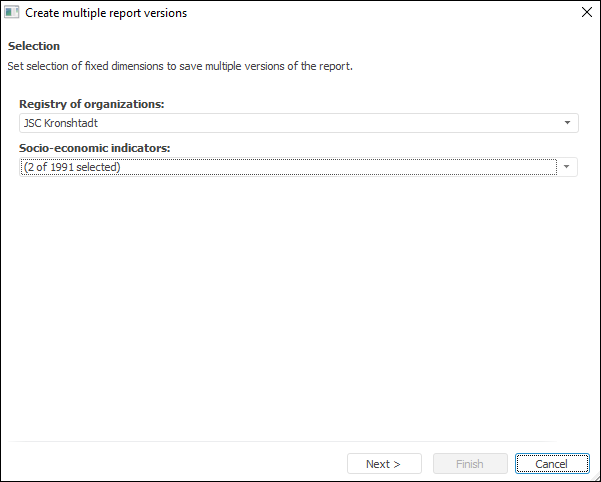 Batch operations are operations executed for multiple report versions. Report versions are based on the selection of fixed dimensions' elements that is set using the controls shared by all report sheets.