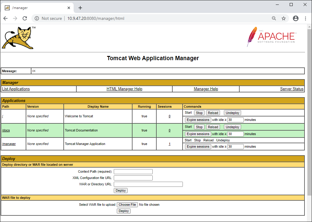 2. Enter administrator credentials specified on installing Apache Tomcat. The page opens after the authorization:
