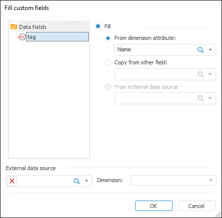 Select the field in the Data Fields section of the dialog box, select the Fill checkbox and select fill option: