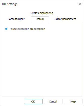 This tab contains settings that determine system's behavior if an exception is thrown when debugging a custom assembly/unit/form.