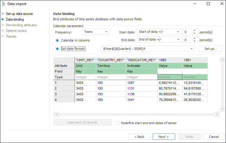 On the Data Binding page specify correspondence between data source fields and time series database attributes.