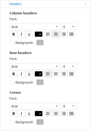 To set up table heading, use the Headers side panel tab. A heading consists of column and row headers and table corner.