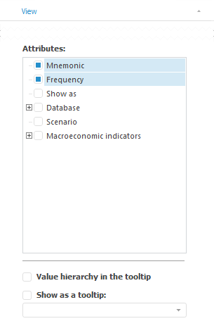 The tab contains the list of all time series attributes, which values can be displayed. If the attribute is a reference to the dictionary, the attributes of this dictionary are listed as the child elements. The Show As and the Database elements are not attributes and are used to manage the view of details about time series.