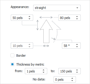 By Scale. Arrow fill is calculated by the color scale. The scale specifies the set of number intervals and the fill method for each interval. All parameters for setting up arrow fill by color scale match the map territory fill parameters by color scale.