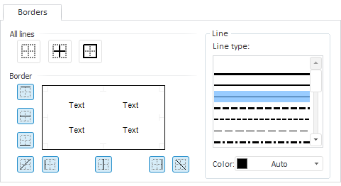 The Presets and Border sections are used to set and remove borders. The look of the borders depends on the settings that are defined in the Line group of elements.