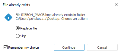 Remember My Choice. Select the checkbox to apply the selected action (replace file or skip saving) for all conflicts.
