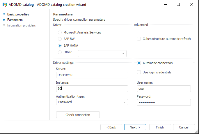 3. Select the SAP HANA driver, in the Server field determine IP address or the SAP HANA server name. Determine data base instance number in the Instance field . The instance number can be obtained from the SAP HANA database administrator. To connect, determine user authentication method, if required, select the Automatic Connection checkbox and determine user name and password. If the Automatic Connection checkbox is deselected, the user name and password will be requested on first connection to directory or its objects inside the current repository connection. If the Cubes Structure Automatic Refresh checkbox is selected, then on opening any cube its structure will be synchronized with structure of the cube on server. The checkbox is deselected by default, the synchronization is performed only on updating directory contents. Click the Finish button.