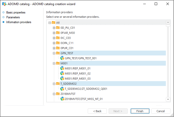 4. Click the Check Connection button. If connection is successful, click the Next button to go to the Information Providers page. On this page one select catalogs or information providers, and ADOMD catalog objects are created based on their information. By default, the All element is selected, all cubes created on server are created. If required, the list of created elements can be reduced, to do this, select required catalogs or separate information providers. The list of selected elements is saved, on updating the ADOMD catalog contents the information only about selected elements is updated.