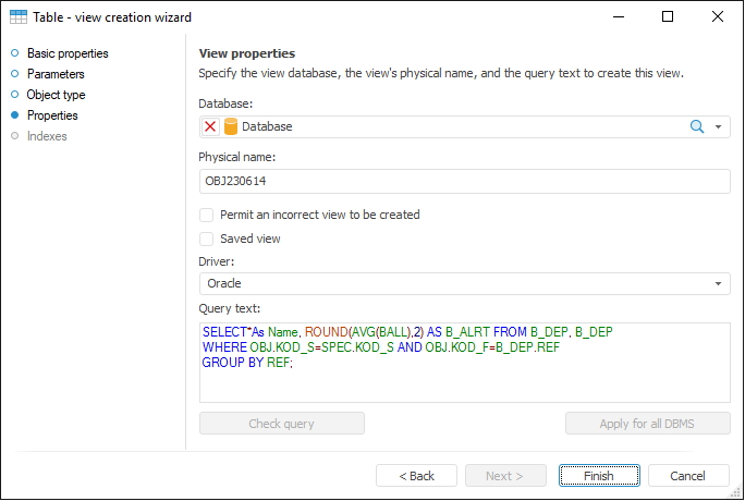 On the View Properties page select the database, to which the view, the view's physical name and view query's text are added: