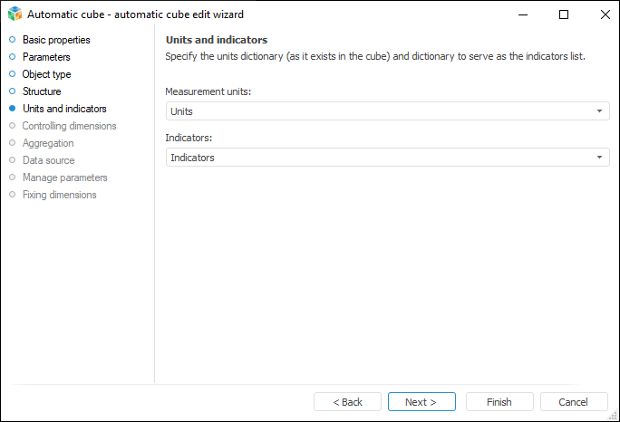 Select the dictionary in the drop-down lists that contain all existing cube dictionaries. These dictionaries must have a certain structure: Units and Indicators. If the structure of the selected indicators or units dictionary does not satisfy the required conditions, a warning message is displayed.